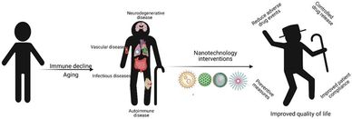 Recently, the aging population has increased exponentially around the globe bringing more challenges to improve quality of life in those populations while reducing the economic burden on healthcare systems. Aging is associated with changes in the immune system culminating in detrimental effects such as immune dysfunction, immunosenescence, and chronic inflammation. Age-related decline of immune functions is associated with various pathologies including cardiovascular, autoimmune, neurodegenerative, and infectious diseases to name a few. Conventional treatment addresses the onset of age-related diseases by early detection of risk factors, administration of vaccines as preventive care, immunomodulatory treatment, and other dietary supplements. However, these approaches often come with systemic side-effects, low bioavailability of therapeutic agents, and poor outcomes seen in the elderly. Recent innovations in nanotechnology have led to the development of novel biomaterials/nanomaterials, which explore targeted drug delivery and immunomodulatory interactions in vivo. Current nanotechnology-based immunomodulatory approaches that have the potential to be used as therapeutic interventions for some prominent age-related diseases are discussed here. Finally, we explore challenges and future aspects of nanotechnology in the treatments of age-related disorders to improve quality of life in the elderly.