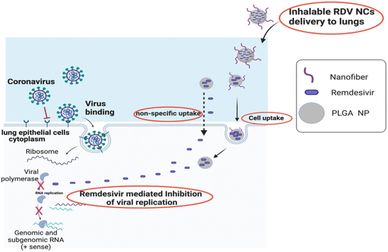 To develop an inhalable drug delivery system, we synthesized poly (lactic-co-glycolic acid) nanoparticles with Remdesivir (RDV NPs) as an antiviral agent against SARS-CoV-2 replication and formulated Remdesivir-loaded nanocomposites (RDV NCs) via coating of RDV NPs with novel supramolecular cell-penetrating peptide nanofibers (NFs) to enhance cellular uptake and intracellular drug delivery. RDV NPs and RDV NCs were characterized using variou techniques, including Transmission Electron Microscopy (TEM), Dynamic Light Scattering (DLS), and fluorescent microscopy. The cytotoxicity of RDV NCs was assessed in Vero E6 cells and primary human lung epithelial cells, with no significant cytotoxicity observed up to 1000 μg mL−1 and 48 h. RDV NCs were spherically shaped with a size range of 200–300 nm and a zeta potential of ∼+31 mV as well as indicating the presence of coated nanofibers. Reverse Transcription-quantitative Polymerase Chain Reaction (RT-qPCR), immunofluorescence and plaque assays of SARS-CoV-2 infected Vero E6 treated with RDV NCs showed significantly higher antiviral activities compared to those of free drug and uncoated RDV NPs. RDV NCs exhibited high antiviral activity against SARS-CoV-2, and the nanocomposite platform has the potential to be developed into an inhalable drug delivery system for other viral infections in the lungs.