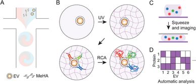 Extracellular vesicles (EVs) are promising for molecular diagnostics, but current analyses are limited by the rarity and compositional heterogeneity of EV protein expression. Therefore, single EV profiling methods require high sensitivity, multiplexing, and throughput to address these issues. Here a single EV analysis technique that utilizes squeezable methacrylated hyaluronic acid hydrogel microparticles (MHPs) is described as a scaffold to immobilize EVs and perform an integrated rolling circle amplification (RCA) assay for an ultra-sensitive and multiplex analysis of single EV proteins. EVs are prepared into MHPs in a high-throughput manner with droplet microfluidics and optimally labeled with antibody-oligonucleotide conjugates in MHPs without steric limitations. By designing MHPs with high compressibility, single EV protein signals are amplified as RCA products that can be aligned on the same plane by physically squeezing MHPs and visualized with low magnification. This method provides a simple and scalable single EV imaging analysis pipeline for identifying multiplex marker expression patterns from single EVs. For validation, the single EV heterogeneity of highly expressed cancer cell markers is profiled across different cancer cell lines. These findings exemplify squeezable MHPs as a robust platform with high sensitivity, multiplexing, and scalability for resolving single EV heterogeneity and advancing molecular assay technologies.