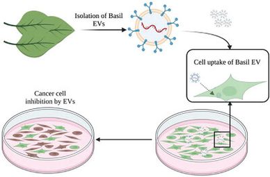 Most living organisms secrete tiny lipid bilayer particles encapsulating various biomolecular entities, including nucleic acids and proteins. These secreted extracellular vesicles (EVs) are shown to aid in communication between cells and their environment. EVs are mainly involved in the signalling and manipulation of physiological processes. Plant EVs display similar functional activity as seen in mammalian EVs. Medicinal plants have many bioactive constituents with potential applications in cancer treatment. Particularly, Basil (Ocimum basilicum), has wide therapeutic properties including anti-inflammatory, anti-cancer, and anti-infection, among others. In this study, we focused on using EVs purified from Apoplast Washing Fluid (AWF) of Basil plant leaves as a biological therapeutic agent against cancer. Characterization of Basil EVs revealed a size range of 100–250 nm, which were later assessed for their cell uptake and apoptosis inducing abilities in pancreatic cancer cells. Basil plant EVs (BasEVs) showed a significant cytotoxic effect on pancreatic cancer cell line MIA PaCa-2 at a concentration of 80 and 160 μg/mL in cell viability, as well as clonogenic assays. Similarly, RT-PCR and western blot analysis has shown up regulation in apoptotic gene and protein expression of Bax, respectively, in BasEV treatment groups compared to untreated controls of MIA PaCa-2. Overall, our results suggest that EVs from basil plants have potent anti-cancer effects in pancreatic cancer cells and can serve as a drug delivery system, demanding an investigation into the therapeutic potential of other medicinal plant EVs
